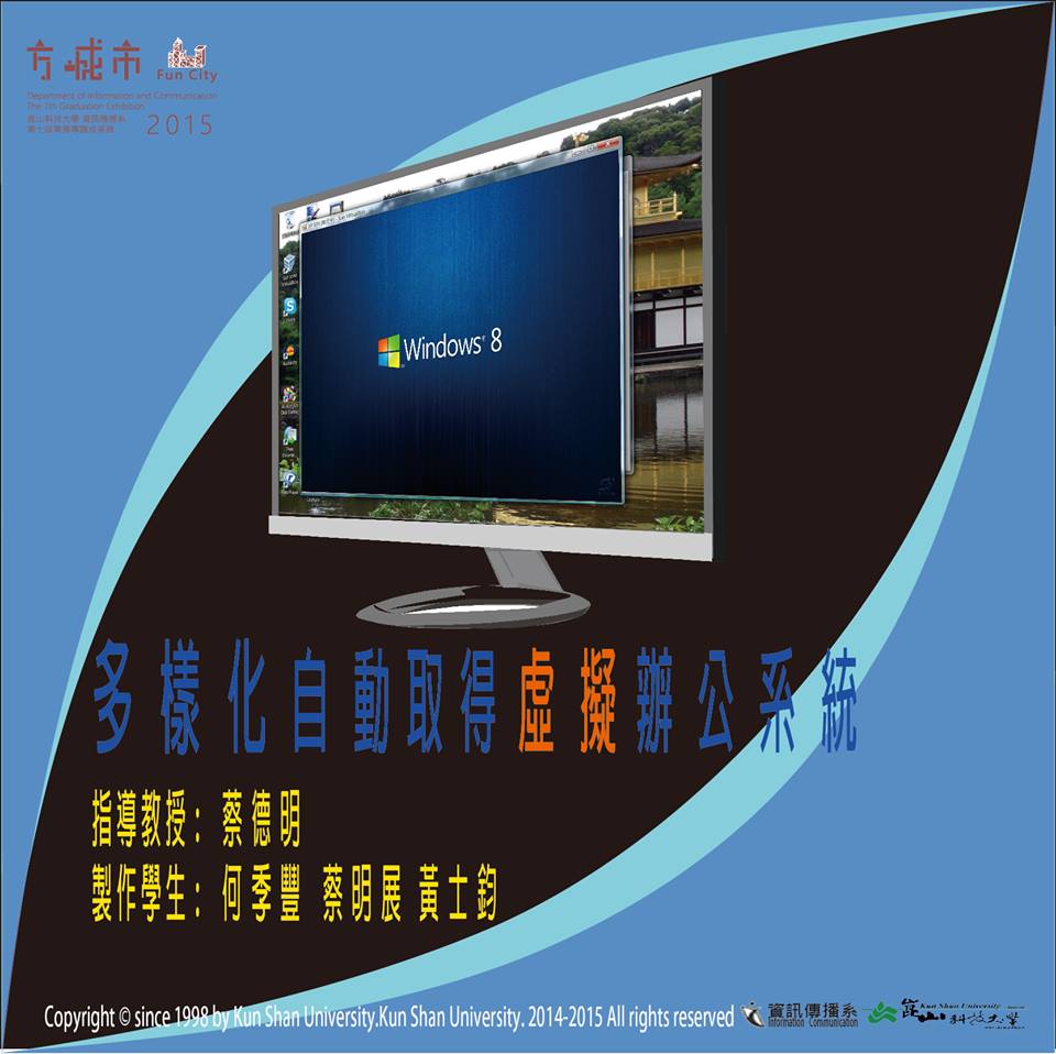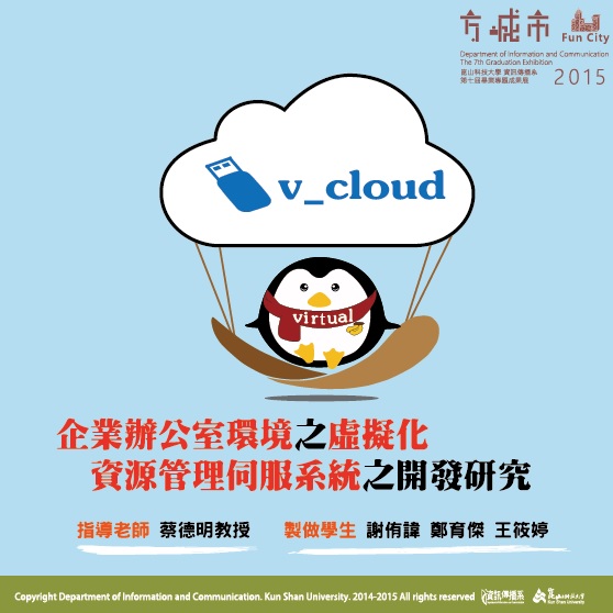 本專題以現有雲端虛擬化技術建置出企業所需之辦公環境 透過本專題之v_cloud系統,管理員可快速建置辦公室所需的各式作業系統與應用軟體。 一般用戶可透過v_cloud取得管理員預先建置之操作環境,也可以建置個人所需的企業辦公環境。 若電腦系統出問題時,管理員可透過v_cloud系統之還原卡功能,快速新建虛擬機、備份等系統管理與強化資料安全,且提供雲端儲存空間給使用者使用。