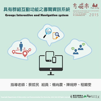 此次的專題是以台南崑山科技大學附近的旅遊景點,幫第一次來崑山科技大學的人規劃出符合需求的資訊。 最後透過互動功能,使的一起出遊的同伴,可以互相知道對方所在,還可以互相傳送訊息,並且透過範圍的限制,也可以防止同伴走失。