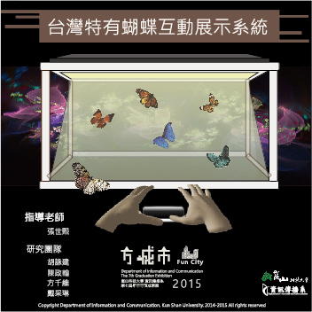 本專題建置出一套顯示展示系統,透過浮空投影將蝴蝶投影出,並且藉由Leap Motion手勢辨識,讓使用者可以去飼養蝴蝶,透過飼養蝴蝶的過程中,去了解蝴蝶的特性、生長期狀況、辨識方式。我們希望浮空投影不再只是展示,更能結合互動以及知識還讓使用者能夠學習到更多不一樣的東西。