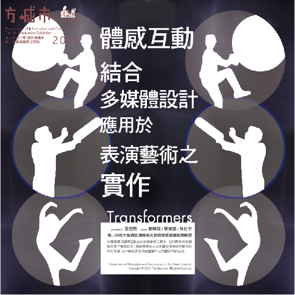 本專題透過DMX訊號標準技術控制燈具,用軟體Ableton Live 9將音效進行有趣的變聲變調,將處理過的訊號傳送至喇叭進行聲音回饋至耳朵,觀眾感受最特別的音效。 我們運用Kinect透過標準電子通訊協定MIDI標準控制所有的軟體,並利用程式將肢體變成特效畫面,進行特效化後將訊號送至投影幕,觀看環繞的投影幕上,特效可透過肢體進行互動。有趣的互動裝置 將這些顏料透過軟體切割投影屏幕達成一幅偉大的畫作,產生有趣的互動裝置。